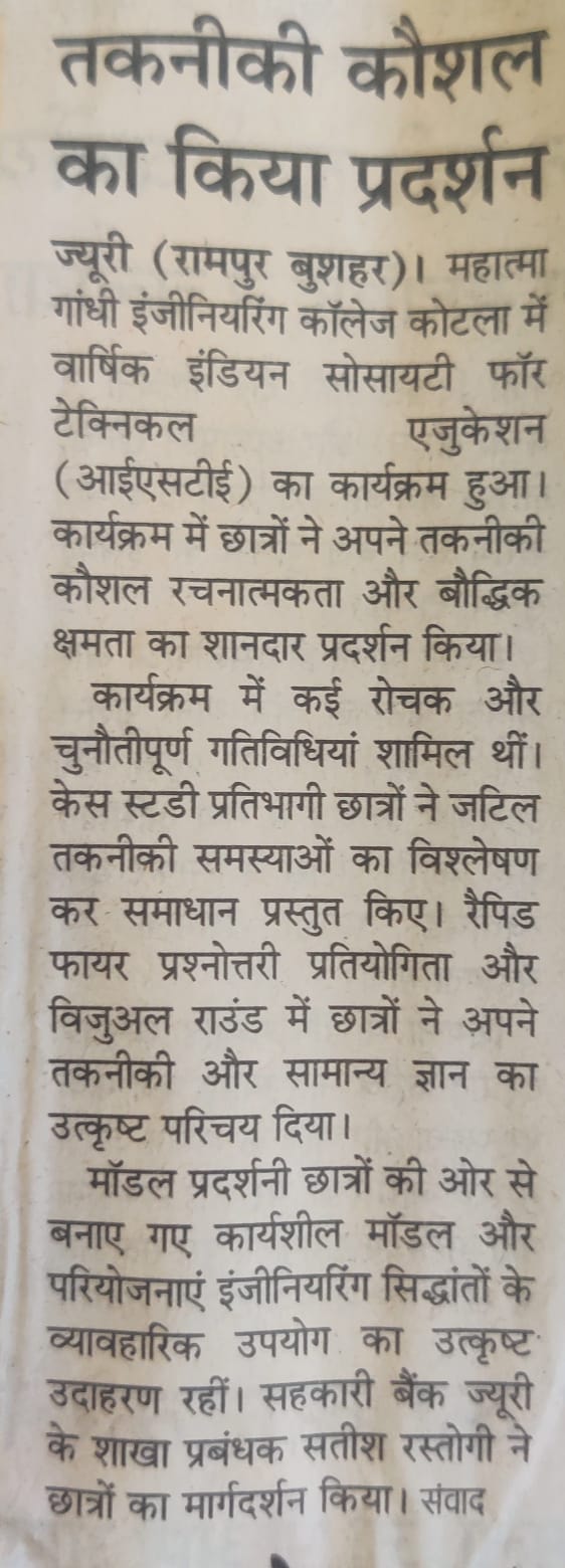 The annual Indian Society for Technical Education (ISTE) program was organized at Mahatma Gandhi Engineering College, Kotrala. In this event, students showcased their excellent technical skills, creativity, and intellectual abilities.